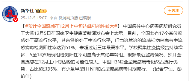 据@新华社消息,中国疾控中心病毒病所研究员王大燕12月5日在国家卫生健康委新闻发布会上表示,目前,全国共有17个省份流感处于高流行水平,其余省份处于中流行水平。门急诊就诊的流感样病例患者中流感病毒检测阳性率达到51%,未超过近三年最高水平。学校聚集性疫情报告持续增多,5至14岁病例组检测阳性率明显高于其他年龄组。根据最近监测情况,预计全国流感在12月上中旬达峰的可能性较大。甲型H3N2亚型流感病毒仍然占流行优势,占比超过95%,有少量甲型H1N1和乙型流感病毒同期流行。(记者李恒、彭韵佳)