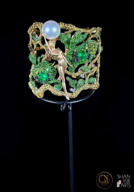 绿野仙踪里鎏金女神造型手镯:14.3mm天然澳白珍珠,3.36克哥伦比亚祖母绿配镶天然黄蓝宝及天然沙弗莱