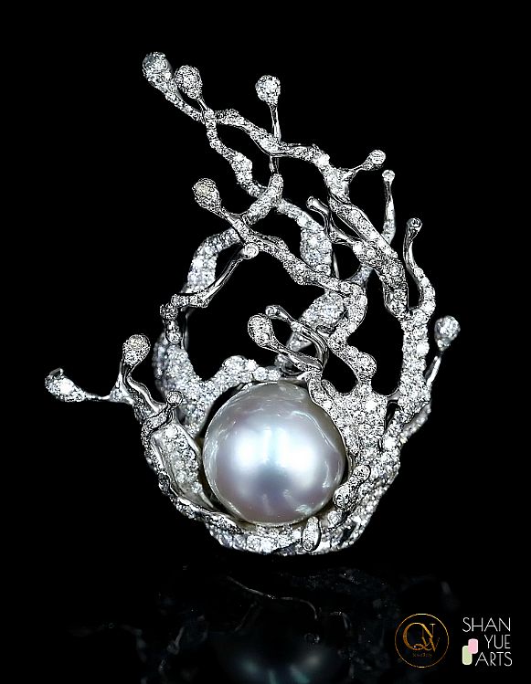 珍珠坠入银辉浪涛的造型胸针/吊坠两用:15mm天然澳白珍珠配镶18k白金及5.3克拉钻石
