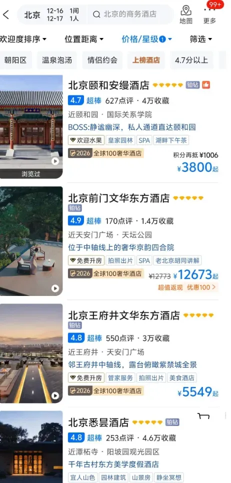 事实上,如果你此刻打开携程,会看到12月中旬的基础房型价格3800元含双早,还附送两张颐和园门票。