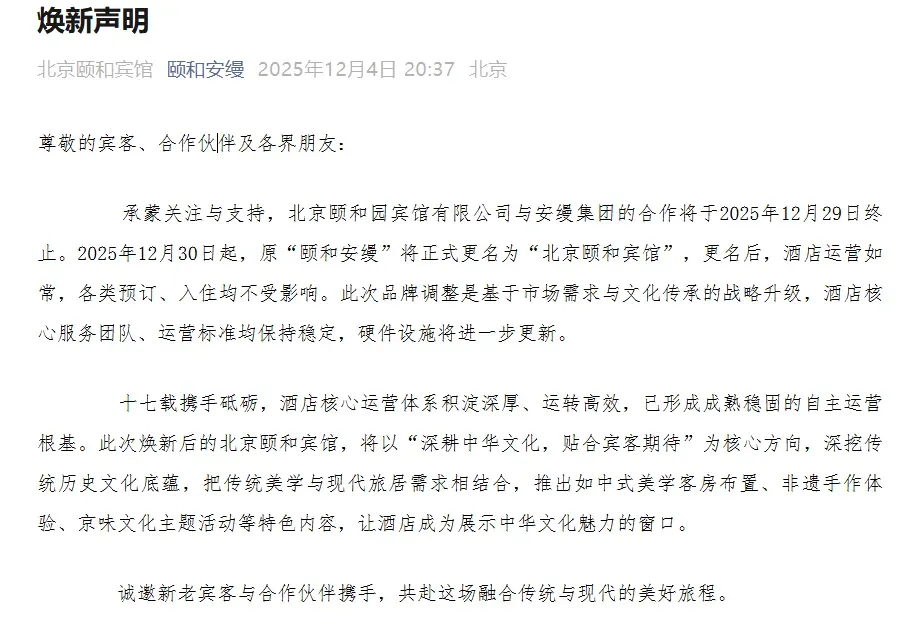 颐和安缦官方公众号显示,从2025年12月30日起,这家曾经站在北京奢华酒店金字塔尖的庞然大物,将正式结束与安缦集团长达十七年的联姻。