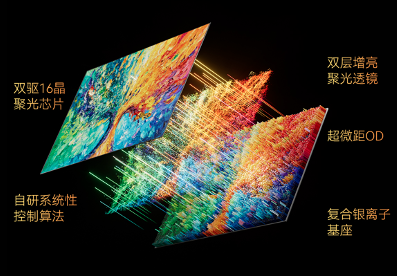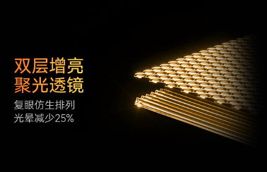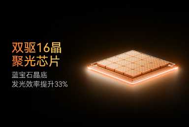 双驱16晶微米级聚合光芯,相比八核发光芯片,同单位体积下,发光效率更高,发光点更精细,细节更加清晰细腻,亮得更耀眼,暗的更深邃,画质还原更加真实。