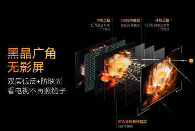“黑晶”、“广角”、“无影”即代表了LR低反层、STW广角层、AG25防眩层,黑晶广角无影屏将三种技术融于一屏,并采用内外双层低反射设计,屏内二次降反,无惧强光干扰,实现极致黑高对比,全视角不偏色,0反光0眩光。