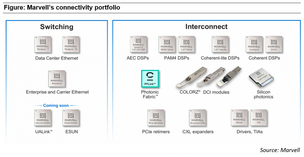 下图展示了Celestial AI的“光子互连技术”如何融入Marvell的产品组合。虽然目前它只是整体布局中的一小部分,但对Marvell而言,这可能是该公司未来战略中至关重要的一环。ESUN代表“面向Scale-Up的以太网”,这是真正需要CPO的应用场景。