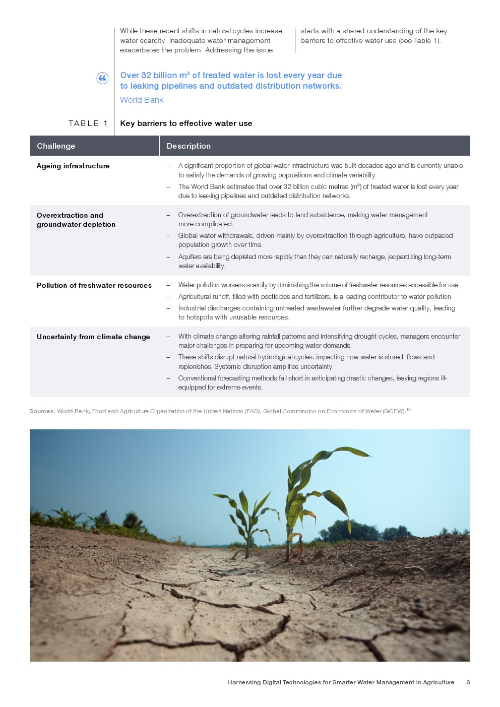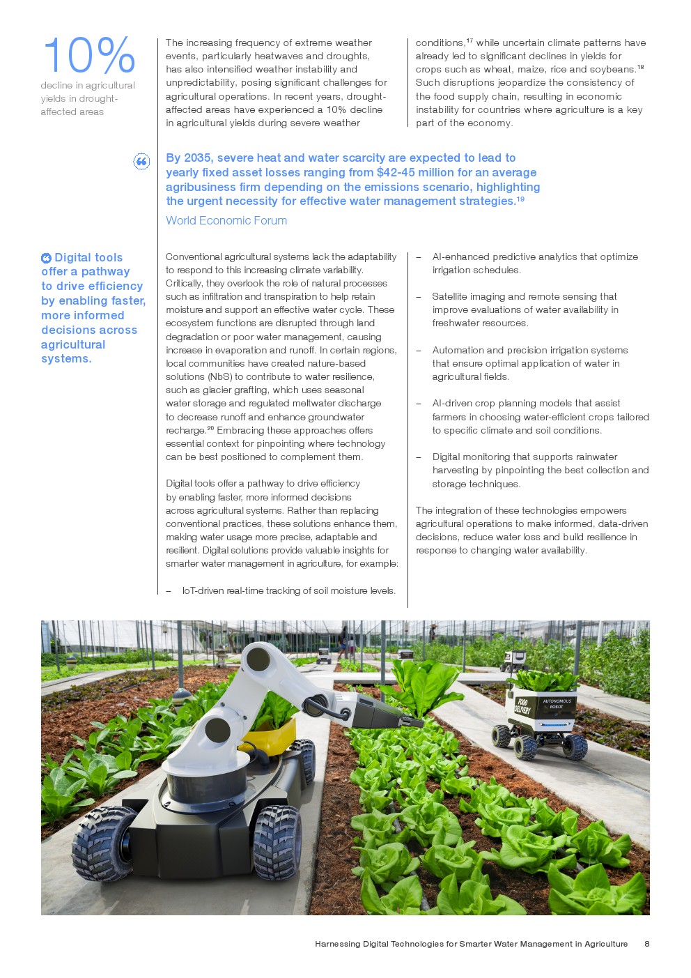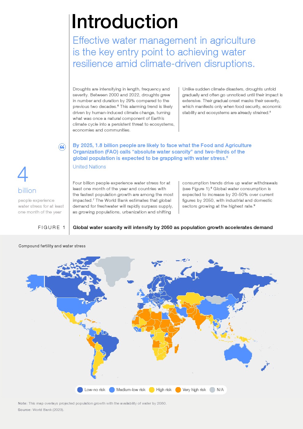 气候变化导致的水文循环紊乱使得某些地区干旱更加严重和频繁。低效的水资源策略进一步消耗了天然水资源并危及粮食安全,给主要淡水消耗者带来了巨大压力。农业正处于这场危机的核心。