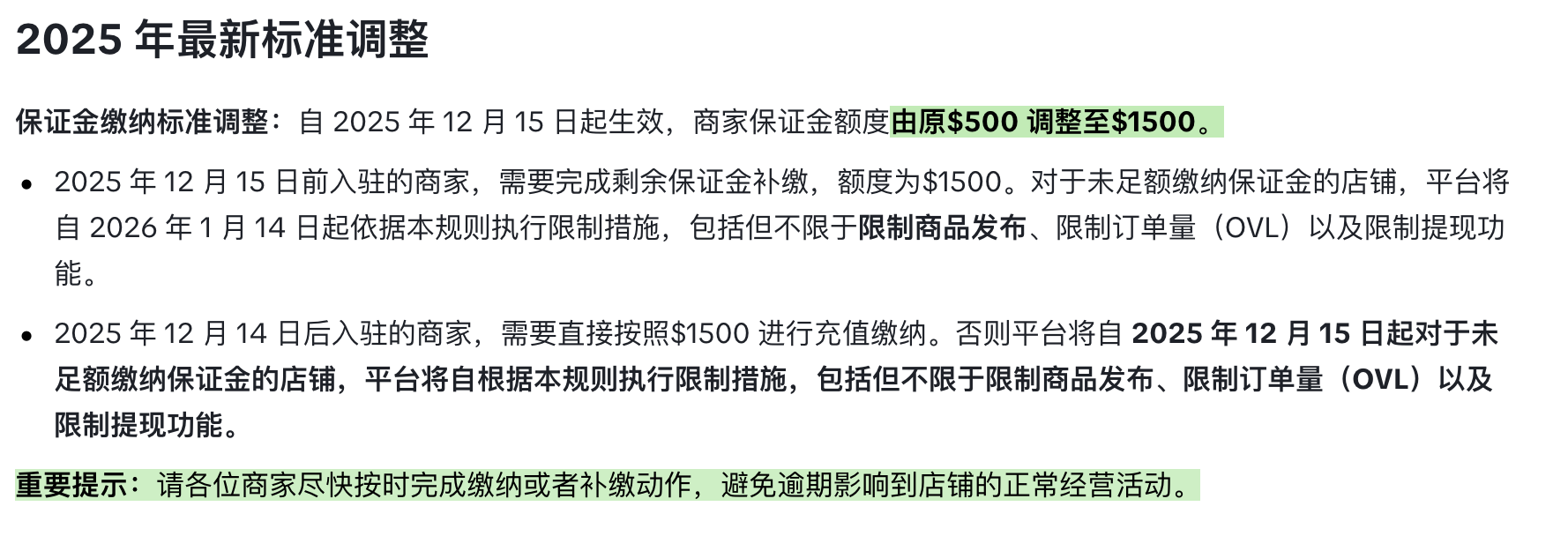 【亿邦原创】12月9日消息,TikTok Shop宣布自2025年12月15日起,美区跨境自运营(POP)商家的保证金额度将由500美元调整至1500美元。