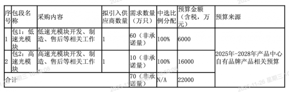 根据此前发布的招标公告,该项目采购内容为高、低速光模块开发、制造、售后等相关工作,需求数量70万只。项目划分为2个包段,项目周期3年,预算金额为2.2亿元(含税)。
