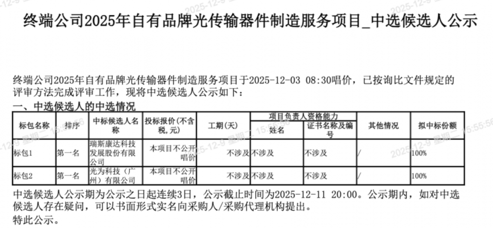 C114讯 12月9日消息(九九)中国移动采购与招标日前发布终端公司2025年自有品牌光传输器件制造服务项目中选候选人公示,瑞斯康达和光为科技中标,项目未公开唱价。