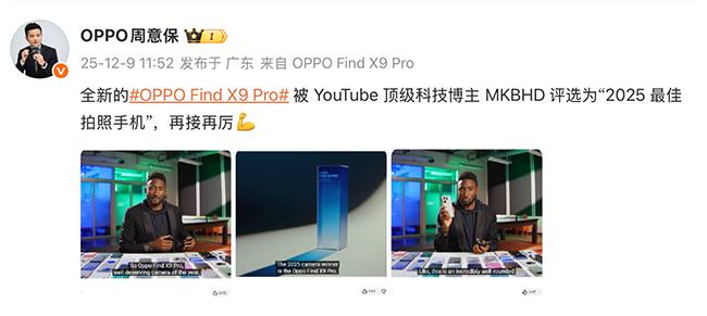随后,OPPO Find系列产品负责人周意保通过微博转发扩散该荣誉,进一步印证了Find X9 Pro在影像旗舰领域的领先地位,也为其全球热销奠定了口碑基础。