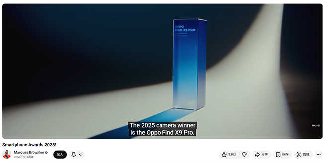 全球顶流科技博主MKBHD在其频道的年度奖项评选视频中,正式将OPPO Find X9 Pro评为2025最佳影像手机,这一权威评价迅速在科技圈引发关注。