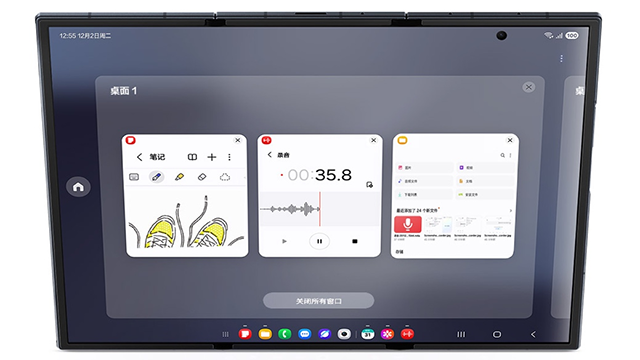 以往需要外联显示设备才能使用的Samsung DeX,现在三星Galaxy Z TriFold可直接在本地独立运行。与此前不同,开启DeX模式后,用户可以创建至多四个独立桌面,每个桌面可同时运行五个应用程序,用户在不同的场景中可以快速切换桌面让效率实现提升。如果需要两块大屏的协同操作,用户也可连接外部显示设备,用扩展模式实现PC般的高效交互。