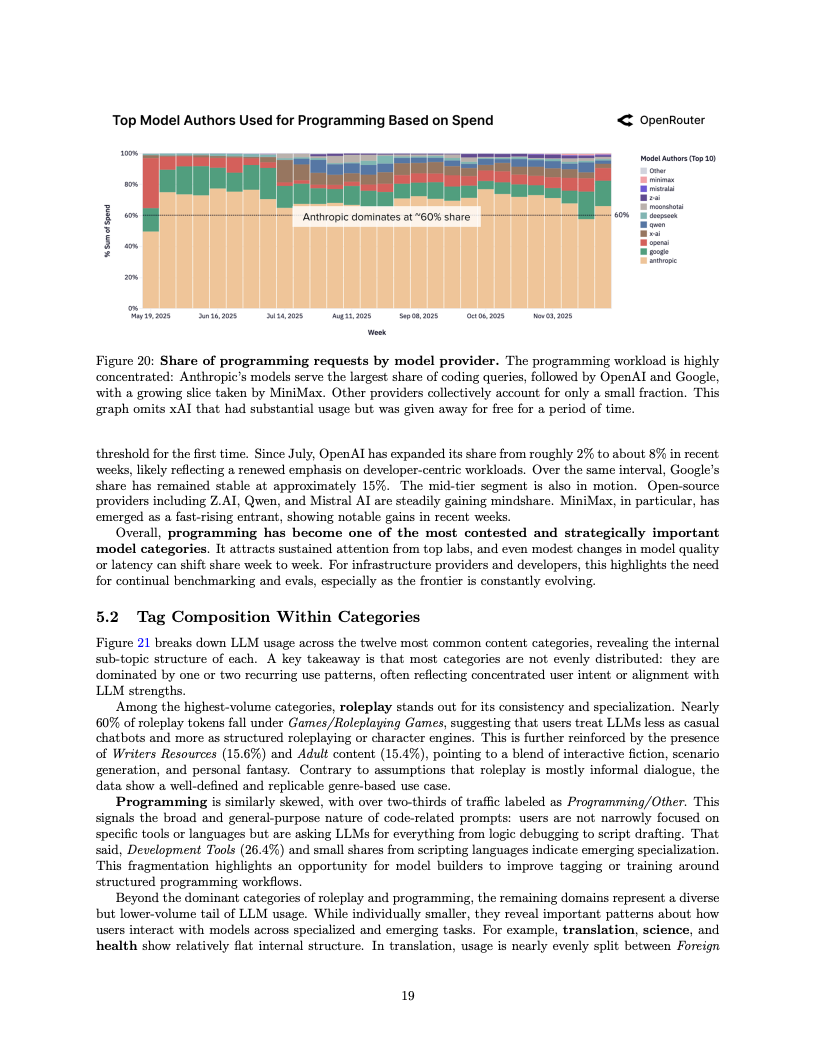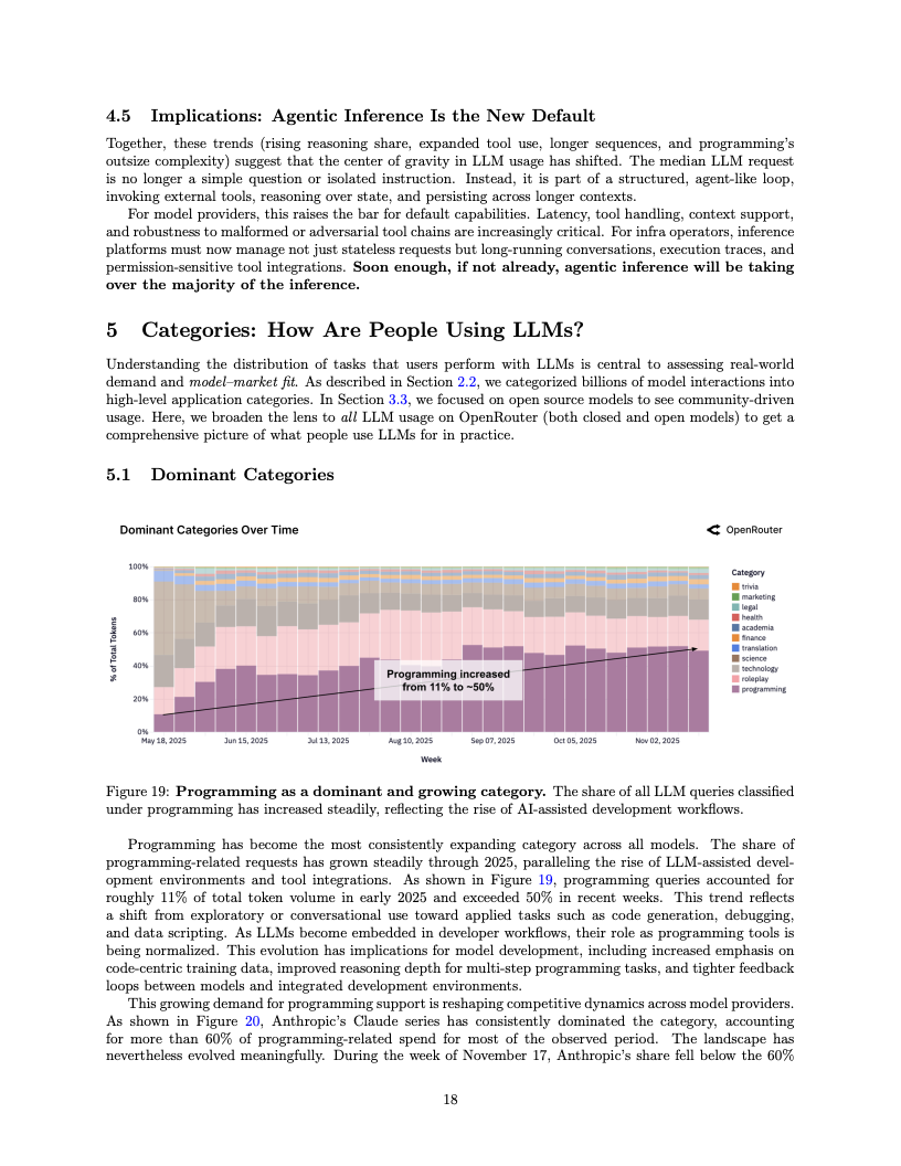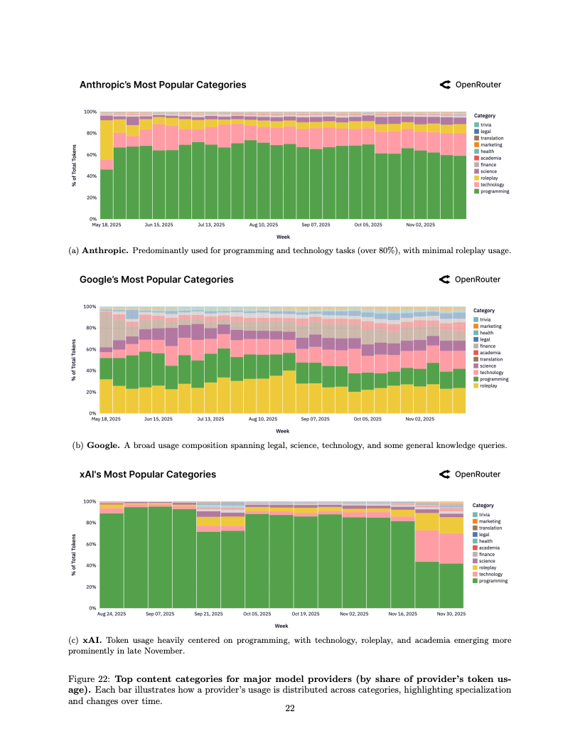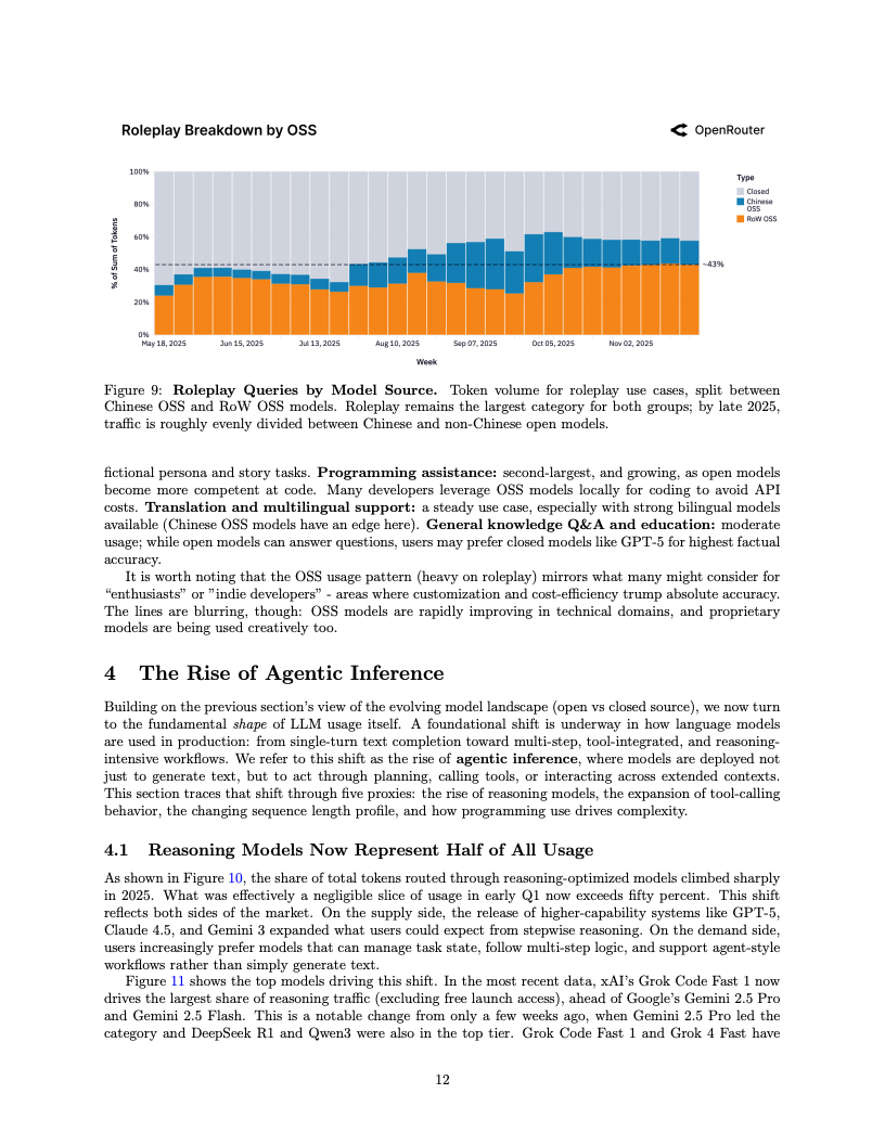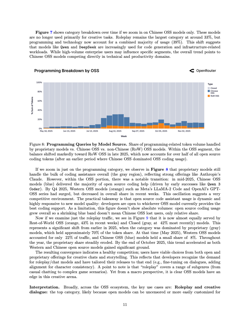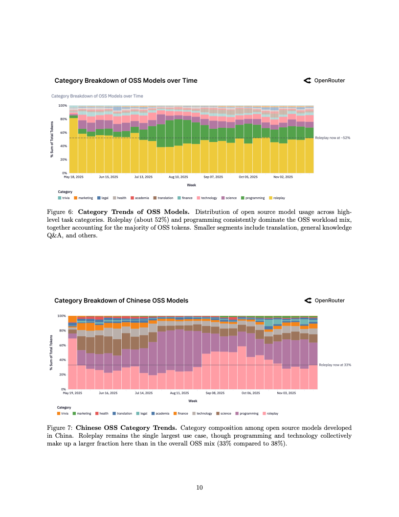 应用场景的结构性变迁同样令人咋舌,编程类任务已成为驱动算力消耗的绝对引擎。编程相关的Token消耗占比从2025年初的仅11%激增至目前的50%以上,这表明大模型已深度嵌入软件工程的核心工作流。与此同时,在开源模型的使用图谱中,角色扮演类交互依然占据了超过50%的份额,显示出在生产力工具之外,创造性与娱乐性需求在长尾市场中依然拥有极强的韧性。