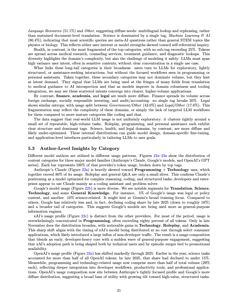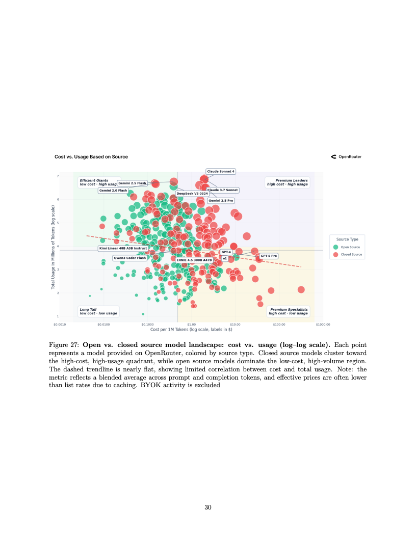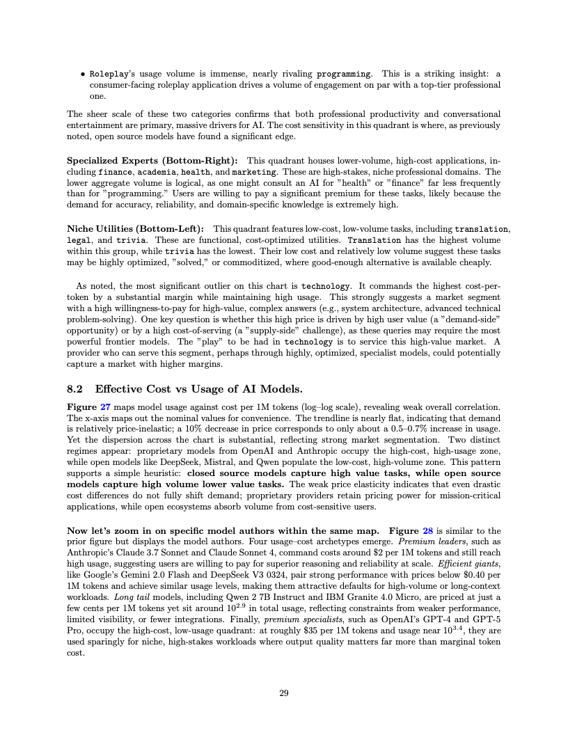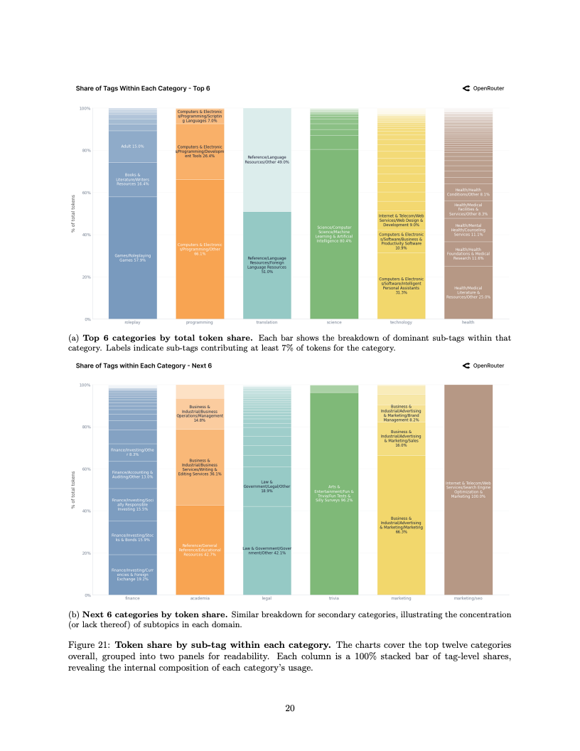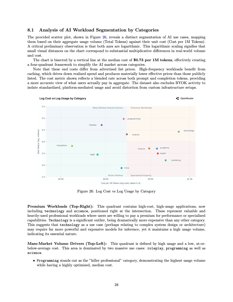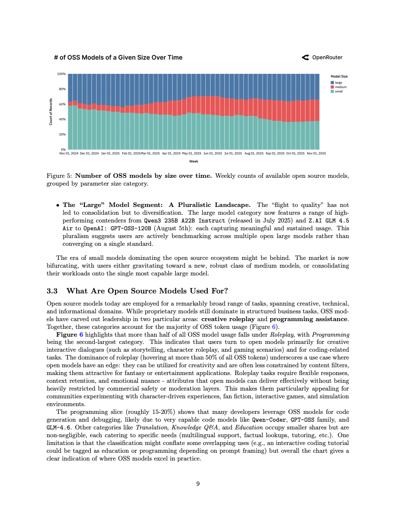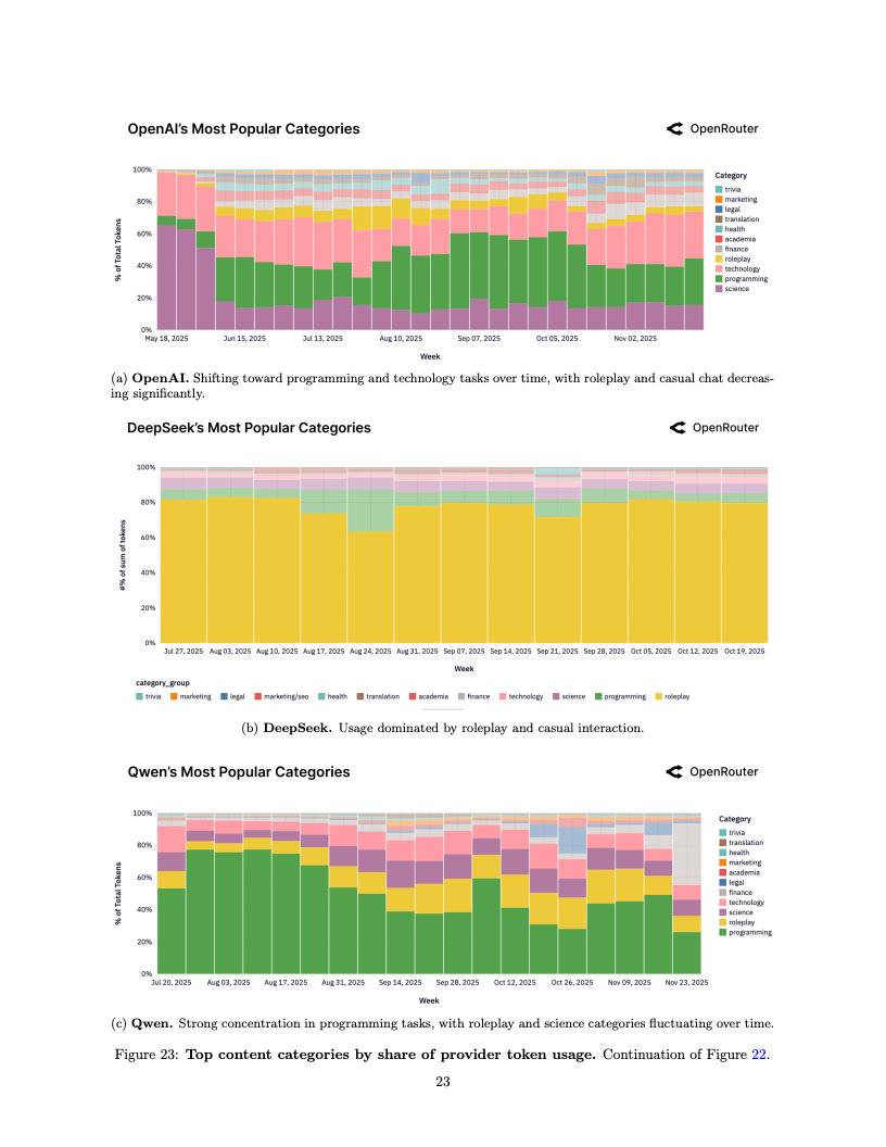 应用场景的结构性变迁同样令人咋舌,编程类任务已成为驱动算力消耗的绝对引擎。编程相关的Token消耗占比从2025年初的仅11%激增至目前的50%以上,这表明大模型已深度嵌入软件工程的核心工作流。与此同时,在开源模型的使用图谱中,角色扮演类交互依然占据了超过50%的份额,显示出在生产力工具之外,创造性与娱乐性需求在长尾市场中依然拥有极强的韧性。
