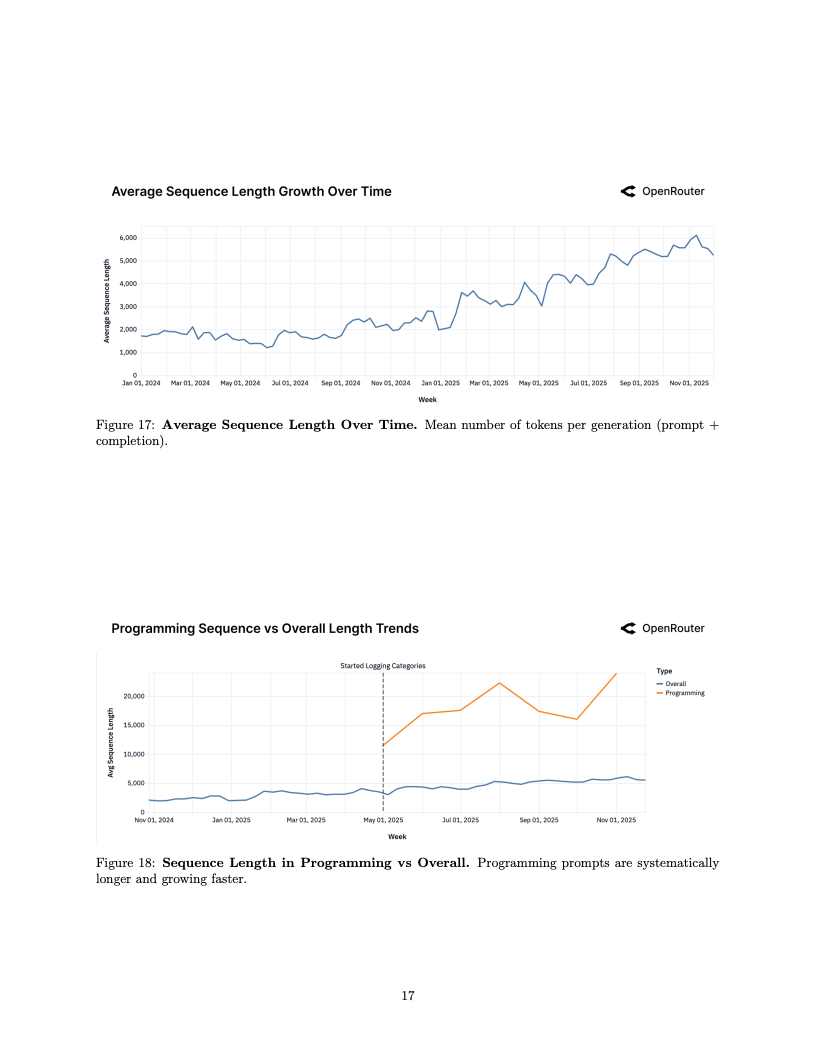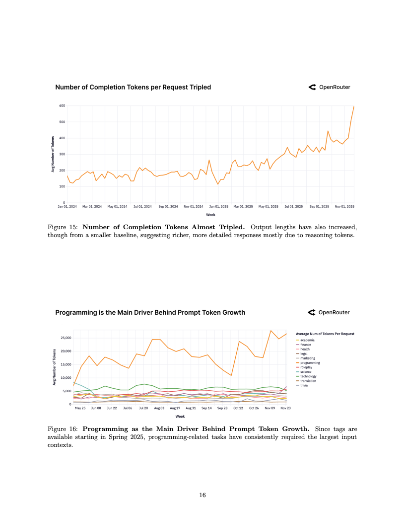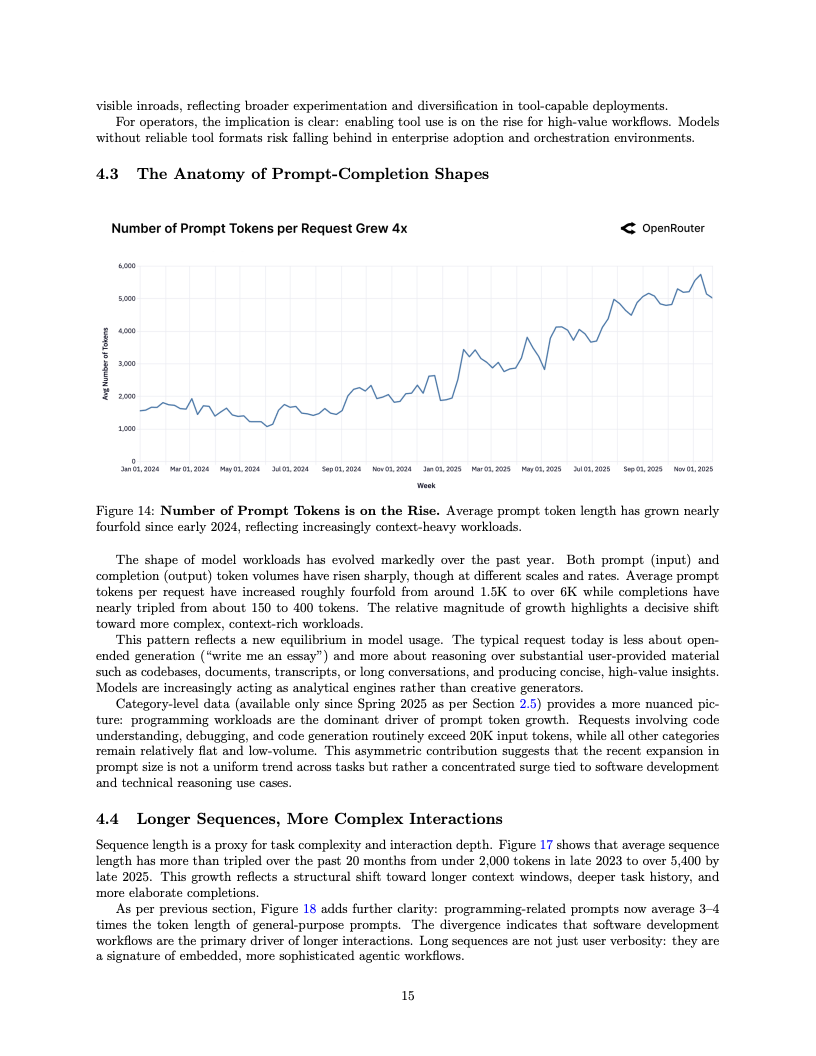 代理式推理的兴起正在重塑人机交互的物理形态,这直接体现在数据输入量的爆发上。统计显示,单次请求的平均提示词长度在一年内增长了四倍,从约1500 Token攀升至6000 Token以上。这种输入端数据的激增,主要由涉及代码库理解与复杂调试的编程任务所驱动,反映出用户正倾向于向模型输入更庞大的上下文信息,以换取更为精准和深度的逻辑输出。