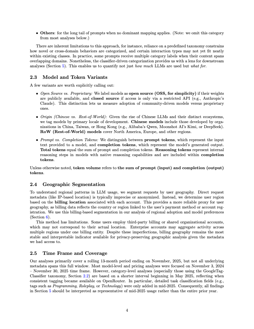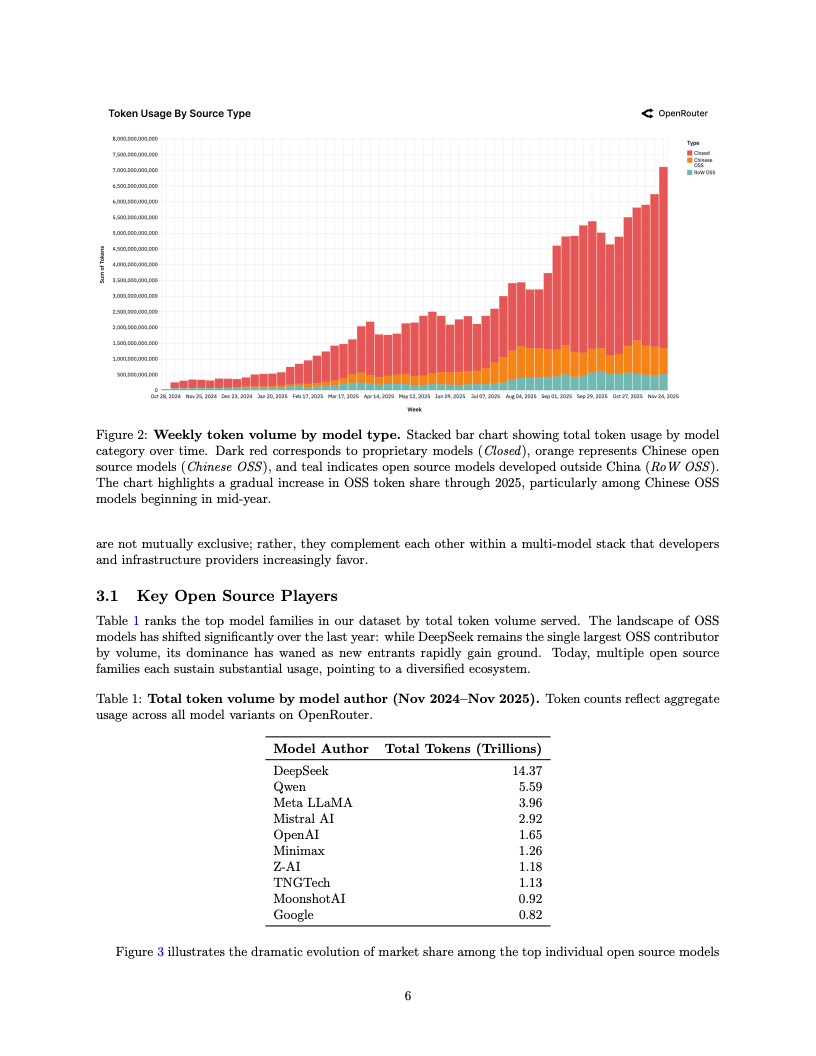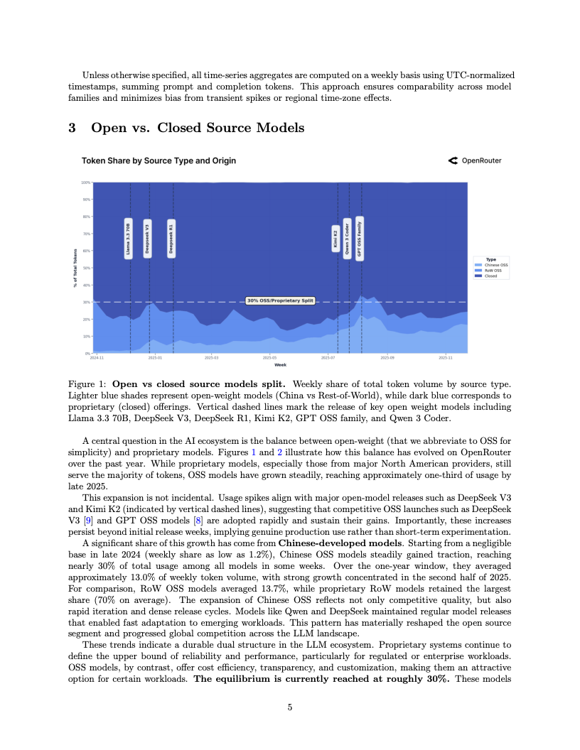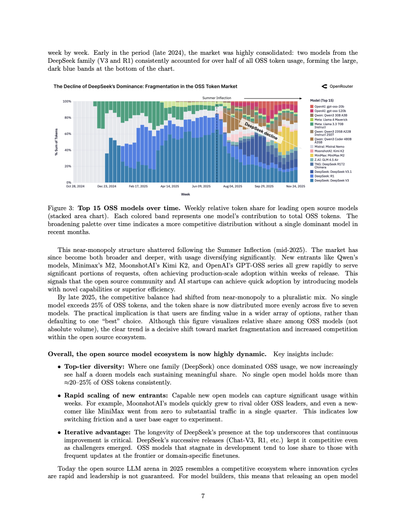 在模型生态的博弈中,开源与闭源体系的角力呈现出微妙的新平衡。目前,开源权重模型已稳固占据约30%的市场份额,且内部格局正经历剧烈的洗牌。数据表明,DeepSeek家族曾经在开源领域一家独大的垄断地位已被打破,目前没有任何单一开源模型能占据超过25%的份额。随着Qwen、Llama及Mistral等新晋力量的崛起,开源生态已演变为一个高度多元化、竞争白热化的多极世界。