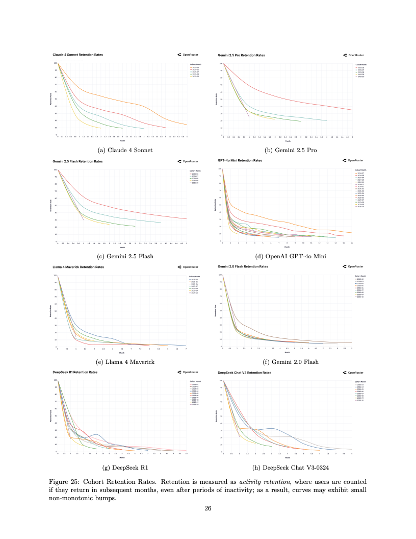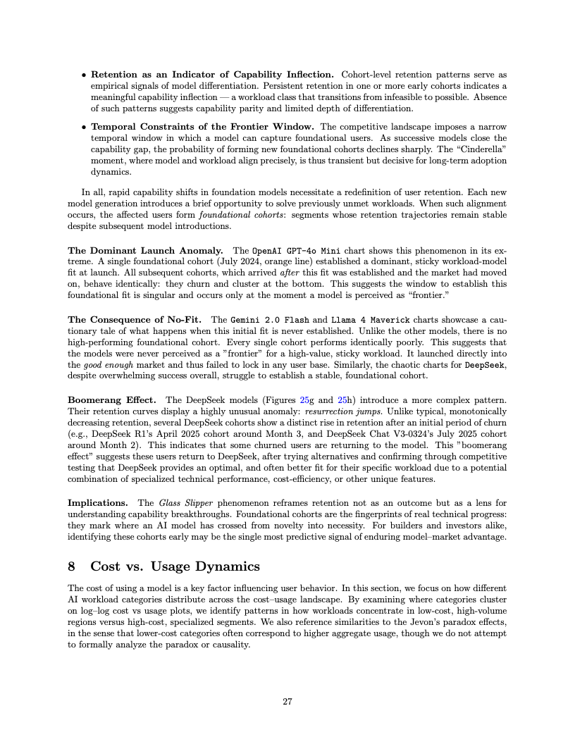 在经济学层面,AI推理服务表现出了显著的价格刚性特征。尽管部分高效能模型大幅降低了Token单价,但高端市场的需求并未因此发生大规模的向下替代。企业级用户仍倾向于为Claude或GPT-4系列的高可靠性支付溢价,这表明在关键任务中,质量的权重远高于成本。留存率分析进一步揭示了灰姑娘的水晶鞋效应,即首个完美解决特定工作流痛点的模型往往能锁定核心用户群,形成极高的转换壁垒。