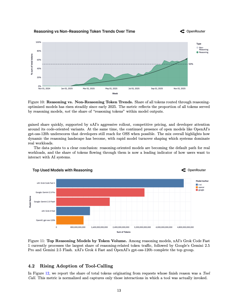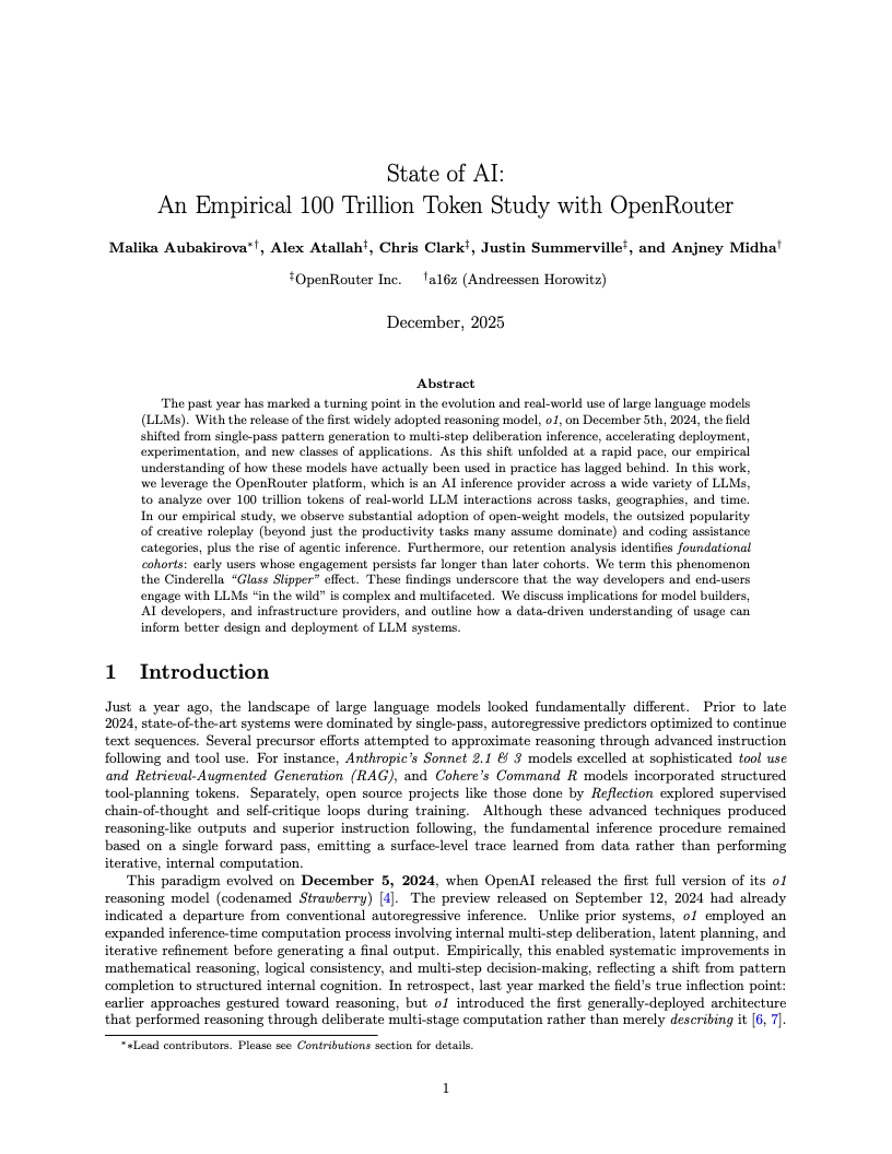 2025年不仅是人工智能发展的又一里程碑,更是大语言模型从单一模式生成向多步推理演进的决定性转折点。基于OpenRouter平台超过100万亿Token的实证数据分析显示,推理型模型的应用占比已历史性地突破50%大关。这一数据剧变标志着行业重心已从单纯的文本补全,转移到了具备内部审议与逻辑规划能力的复杂计算上,OpenAI o1等推理模型的广泛采用正是这一趋势的直接印证。