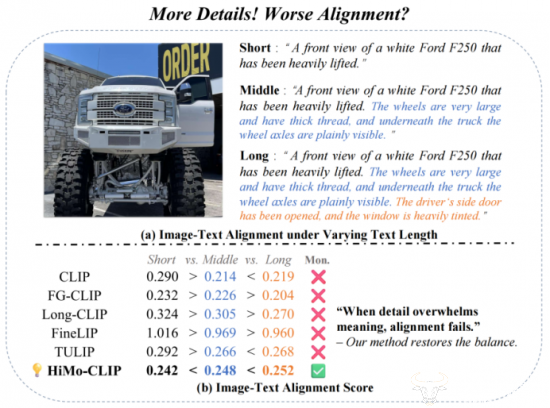 随着描述变长,现有模型分数下降,而HiMo-CLIP(绿勾)稳步提升