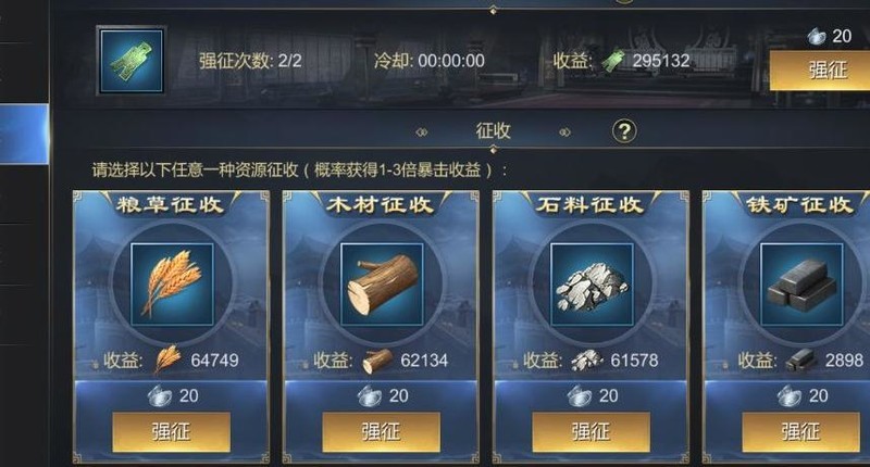 就像电视剧里地主收租那样,资源获取也有快慢之分。若财力雄厚,可直接花钱加速,省去等待;否则只能按部就班,耐心等候冷却。有钱还能强行征收,体现的就是资本优势。类似屯田机制,缺什么取什么,资源充足则随心所欲。