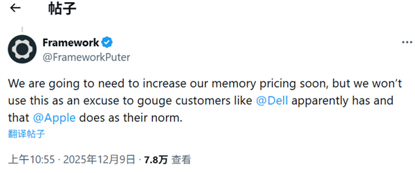不过,Framework坦言,一旦现有库存耗尽,它们也不得不遵循市场规则,提升内存价格,将部分成本转嫁至消费者。