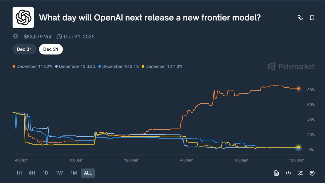 目前的市场情绪也已经彻底被点燃。在预测平台 Polymarket 上,原本押注 12 月 9 号发布的资金开始转向,目前的风向标死死盯着 12 月 11 日(本周四)。