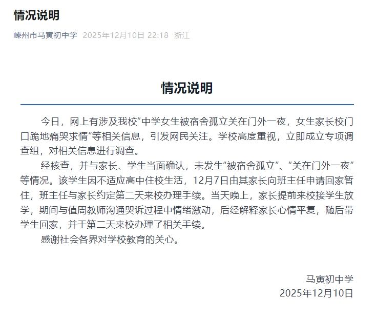 经核查,并与家长、学生当面确认,未发生“被宿舍孤立”、“关在门外一夜”等情况。该学生因不适应高中住校生活,12月7日由其家长向班主任申请回家暂住,班主任与家长约定第二天来校办理手续。当天晚上,家长提前来校接学生放学,期间与值周教师沟通哭诉过程中情绪激动,后经解释家长心情平复,随后带学生回家,并于第二天来校办理了相关手续。