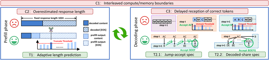 交错的计算和访存瓶颈模式都限制了效率。分块半自回归解码的每个新块都会触发全局预填充以刷新 KV cache,占总推理延迟的 30-40%。随着更细粒度的并行解码设计来减少解码步数,计算密集型的预填充阶段将进一步占据主导地位。亟需一个算术强度感知的推理框架联合缓解计算和访存瓶颈。