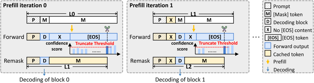 该策略在每一轮预填充后考察整个响应序列,检测是否存在 [EOS] token。一旦识别出存在这一终止标记,就会提取其置信度分数并将其与预定义的截断阈值进行比较。如果置信度超过阈值,则响应将在该位置被截断。如果未检测到 [EOS] token,或者对应的置信度均低于阈值,则响应长度保持不变。这种渐进式策略最大限度地减少了预填充阶段的算术强度和冗余计算,随着模型的不确定性和多样性逐渐收敛还带来了性能增益。