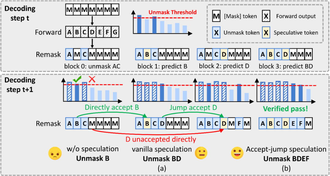 1. 跳跃接收推测策略。推测解码的草稿块也同时作为中间验证块,实现草稿 token 跨块的跳跃验证和接收,从而在单次解码迭代中解掩码更多 token,在有限的推测块预算下显著提高解码效率。