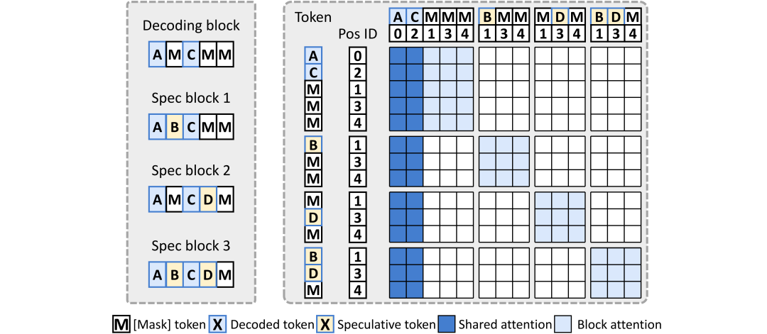 2. 解码共享推测策略。考虑各推测块间的高度相似性,块内已解码 token 的 KV 状态也可以只在当前块内计算更新,并在多个推测块之间共享。随着解码的进展,推测块的计算成本逐渐降低,为更多推测快的拓展提供了机会。