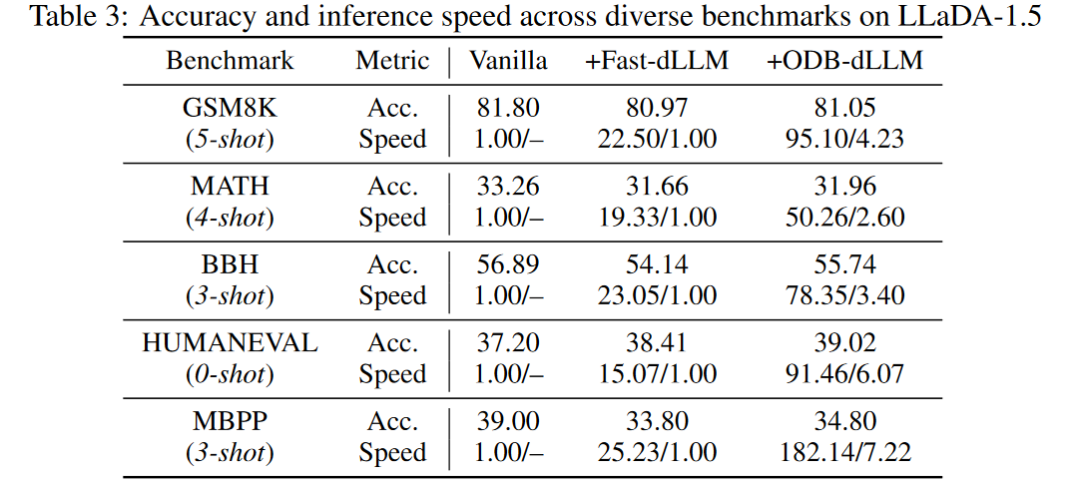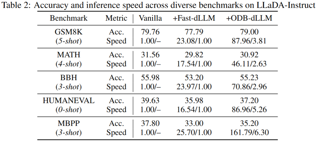 研究团队在两种代表性的开源扩散语言模型LLaDA-Instruct和 LLaDA-1.5 上评估了 ODB-dLLM。在多个数据集上对比 Vanilla model 和 Fast-dLLM 推理框架结果如下: