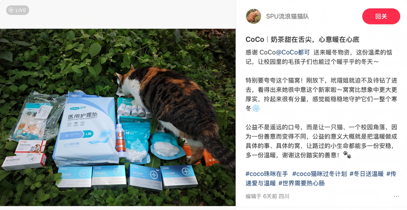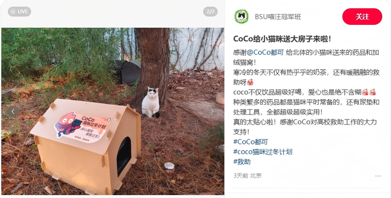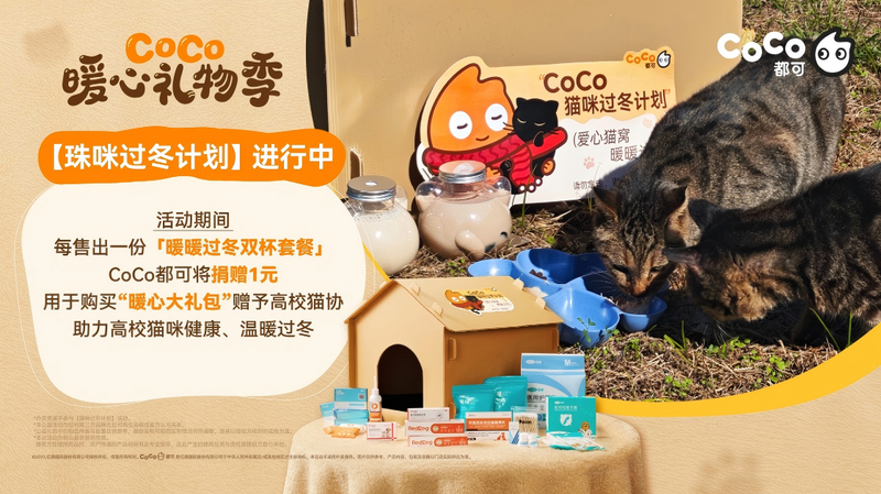 在公益层面,CoCo都可关注到校园里小猫“寒假生存难”“抵抗力下降”“易得传染病”等切实痛点,将公益合作网络扩展至全国高校猫协,为校园的猫咪们捐赠“暖心公益礼包”。
