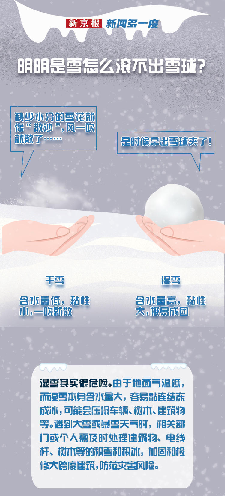 气象专家称,这场雪属于“干雪”。据了解,干雪的水分含量少,雪中的空隙被空气充满,同体积下质量相对较轻,比较蓬松、不易融化,很容易形成积雪。相比起南方含水量较高的湿雪,干雪不易攥成团,打雪仗时容易散开。当干雪落在车上,即使积了厚厚一层,也很容易被风吹散。湿雪则很容易在车窗、车门上结冰。