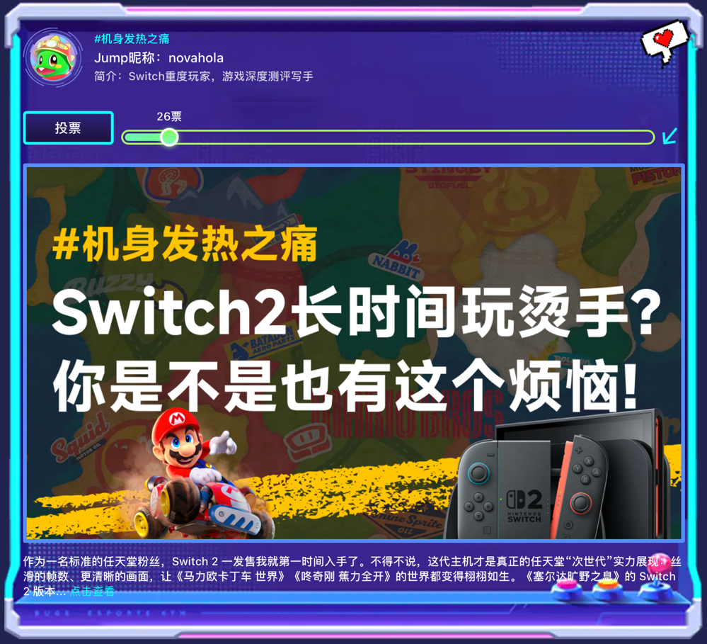 本次的社区讨论并不是对Switch的吐槽,而是从任天堂Switch2真实痛点出发,旨在为玩家解锁“简单+好用”的解决方式,并有任天堂Switch2游戏主机和三星 P9 Express固态存储卡超级大礼等待幸运玩家来解锁。活动五大Jump超级版主建立投票阵营,涵盖了存档危机、机身发热、频繁插拔卡带、空间焦虑和加载等待五大痛点。