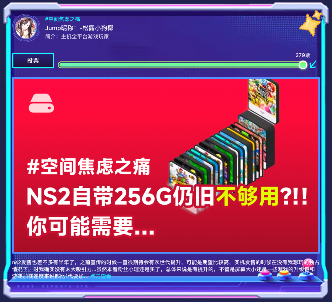 尽管本次活动刚上线不久,但玩家们的参与热情非常高。从目前的社区投票情况来看呈现绝对的一边倒现象,由@松露小狗椰版主发起的#空间焦虑之痛话题,以高达279的票数遥遥领先,甚至超过了票数第二痛点话题的六倍,而且随着活动的推进,这个投票的差距还将持续增长,由此可见,Switch2的加量升级或许让玩家们感觉“瑕不掩瑜”,但存储焦虑绝对是头号痛点。