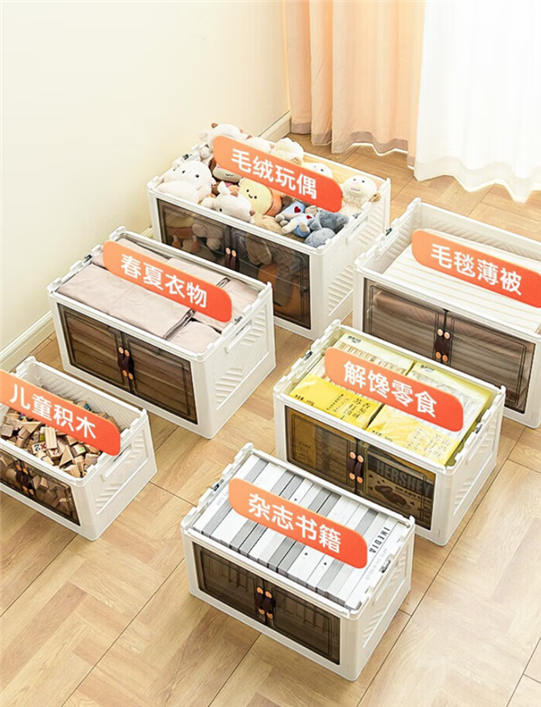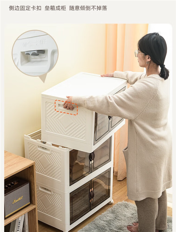 侧边固定卡扣,垒箱成柜,随意倾倒不掉落。