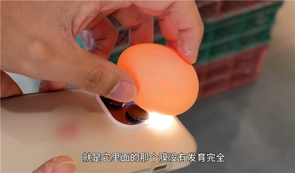 然后打开手机补光灯,照射鸡蛋,能看到内部有很多小点点的比较好。
