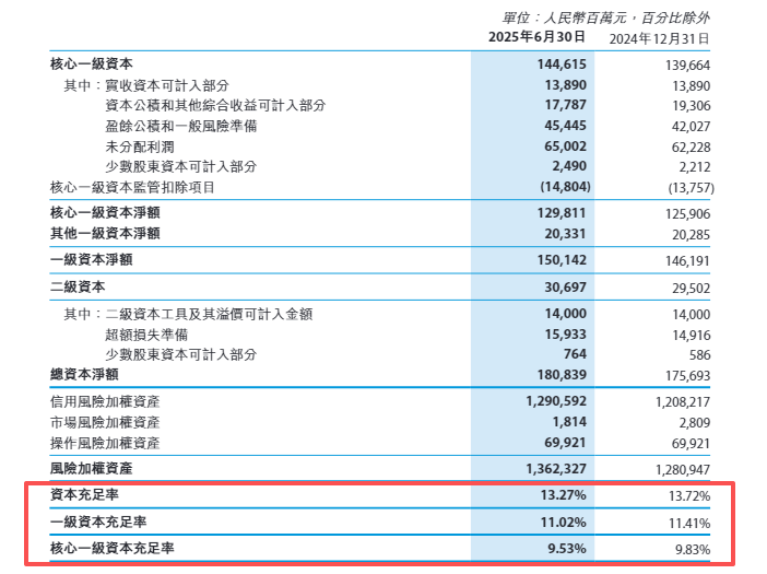 值得注意的是,徽商银行的资本充足率指标均有下降。截至2025年6月末,该行资本充足率、一级资本充足率及核心一级资本充足率分别为13.27%、11.02%和9.53%,较上年末分别下降0.45个百分点、0.39个百分点和0.3个百分点。