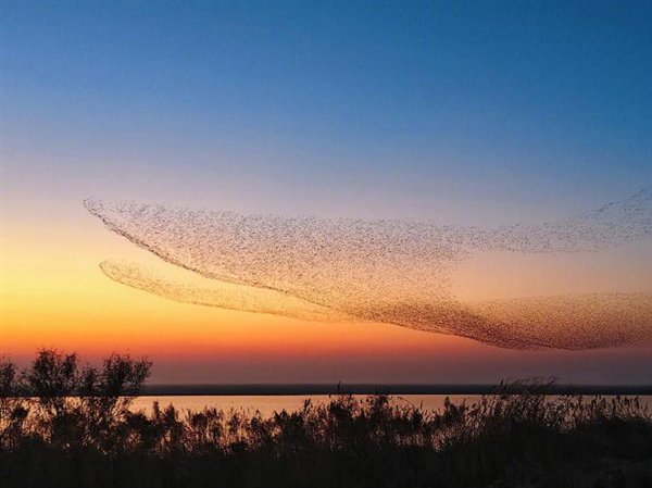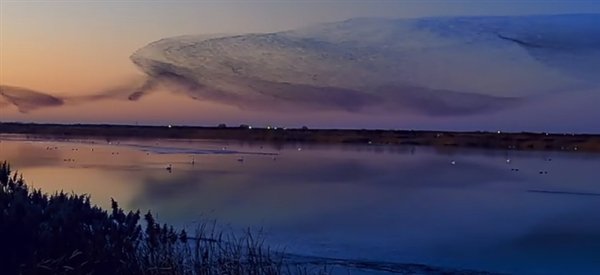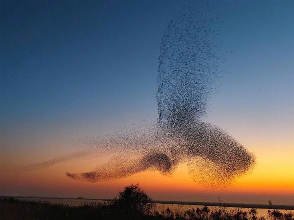 数十万只候鸟在落日的余晖中集群迁徙,它们时而如巨鲸翻身,时而如大鹏展翅,自然变换出巨鲲的形象。