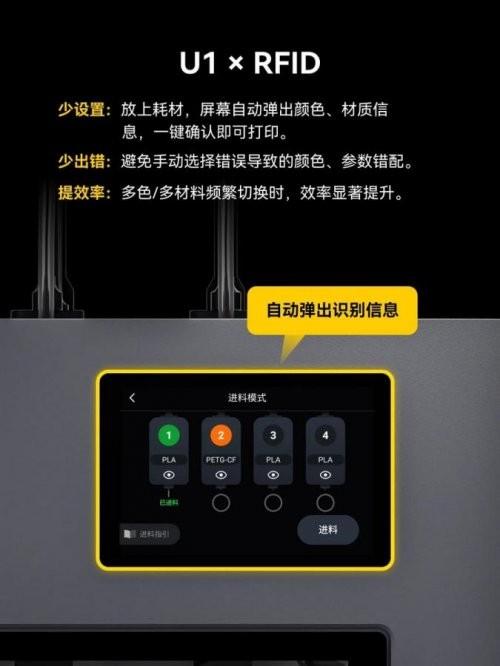 操作便捷性上,Snapmaker U1同样亮点十足。采用透明背板与模块化设计,开箱后即可快速组装完成;配备的自动耗材管理系统可同时装载4卷耗材,从检测到进料全程自动化,搭配RFID技术能自动识别官方耗材的颜色、类型等参数,无需手动输入。更有备用模式贴心护航,当耗材耗尽时,设备会自动切换至匹配备用卷,彻底告别手动穿料、反复拉扯的繁琐操作,让打印过程更顺畅。
