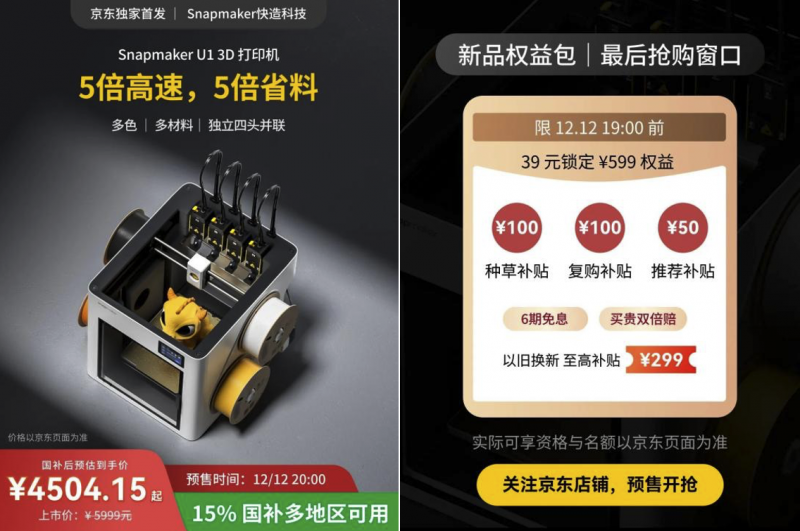 12月16日至17日期间,Snapmaker U1还会亮相京东MALL北京双井店的线下新品体验会,消费者可近距离感受U1 3D打印机5倍高速、5倍省料的极致性能、观看打印过程,到场互动还可领取精美礼品。现在起,打开京东搜索“Snapmaker U1”参与预约,还可抢先以39元入手京东“599元权益包”,提前锁定预售专属福利。12月12日晚8点,锁定SNAPMAKER京东自营旗舰店,以超值价格入手这款高效、省料、精准、便捷的多色多头3D打印新品,解锁创意表达的无限可能。