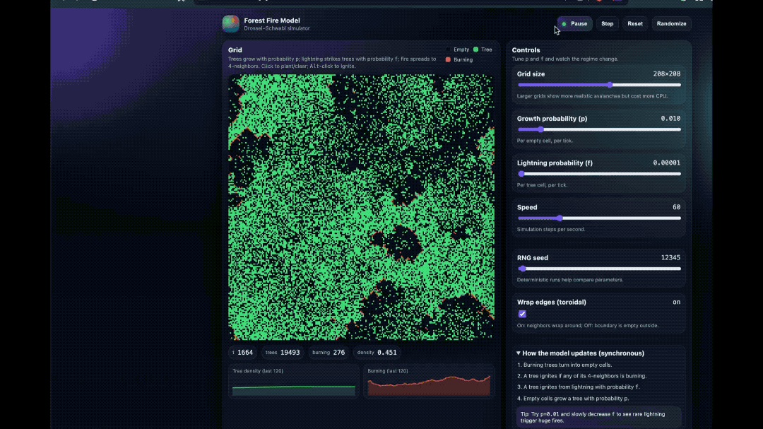 也有网友分享自己用 GPT-5.2 做了一个森林火灾的模拟器,能够调节速度、片区大小、和火焰燃烧范围等等。