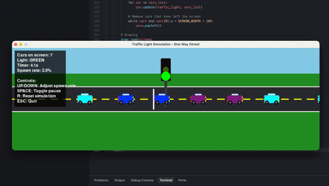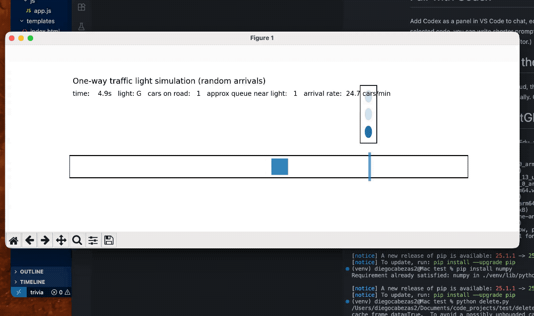 网友输入的提示词是「write a python code that visualizes how a traffic light works in a one way street with cars entering at random rate.」(编写一个 Python 代码,模拟单行道交通灯的工作原理,并可视化随机速率进入的车辆)。