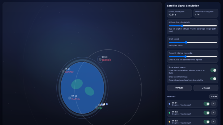 ▲提示词:Create an interactive HTML, CSS, and JavaScript simulation of a satellite system that transmits signals to ground receivers. The simulation should show a satellite orbiting the Earth and periodically sending signals that are received by multiple