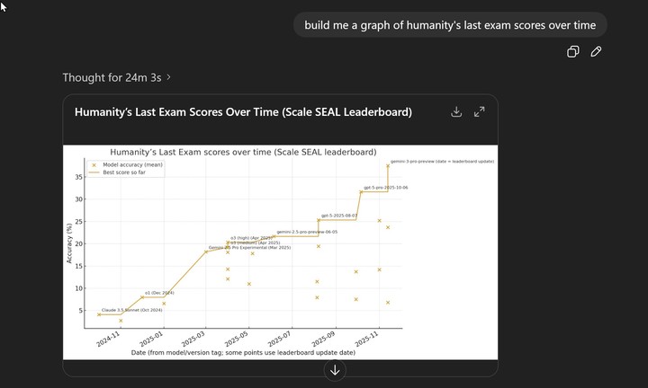 例如有用户分享,输入提示词「帮我绘制一张 HLE 测试成绩的图表」,GPT-5.2 Pro 硬是花了 24 分钟才得出这张表。