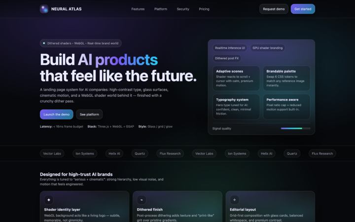 ▲提示词:You are the top 0.1% designer and developer for the world’s cutting-edge innovation on front-end design and development. You are tasked to create a full landing page with {Dither + Shaders} using {WebGL + ThreeJs} in the styling of an uploaded image for the AI company. – Focus mainly on the design part, not the development. Import all necessary files and libraries: Three.js、WebGL、GSAP、Any other animation libraries related to 3D development.