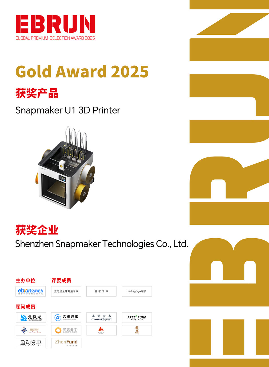 在激烈的角逐中,全球数字制造工具领域的创新先锋Shenzhen Snapmaker Technologies Co.,Ltd.(深圳快造科技有限公司) 凭借其对3D打印痛点的精准击破脱颖而出。其众筹明星产品 “Snapmaker U1 3D Printer” 经过层层评审,成功斩获2025届最高荣誉奖项——EBRUN全球好物Gold Award 2025。