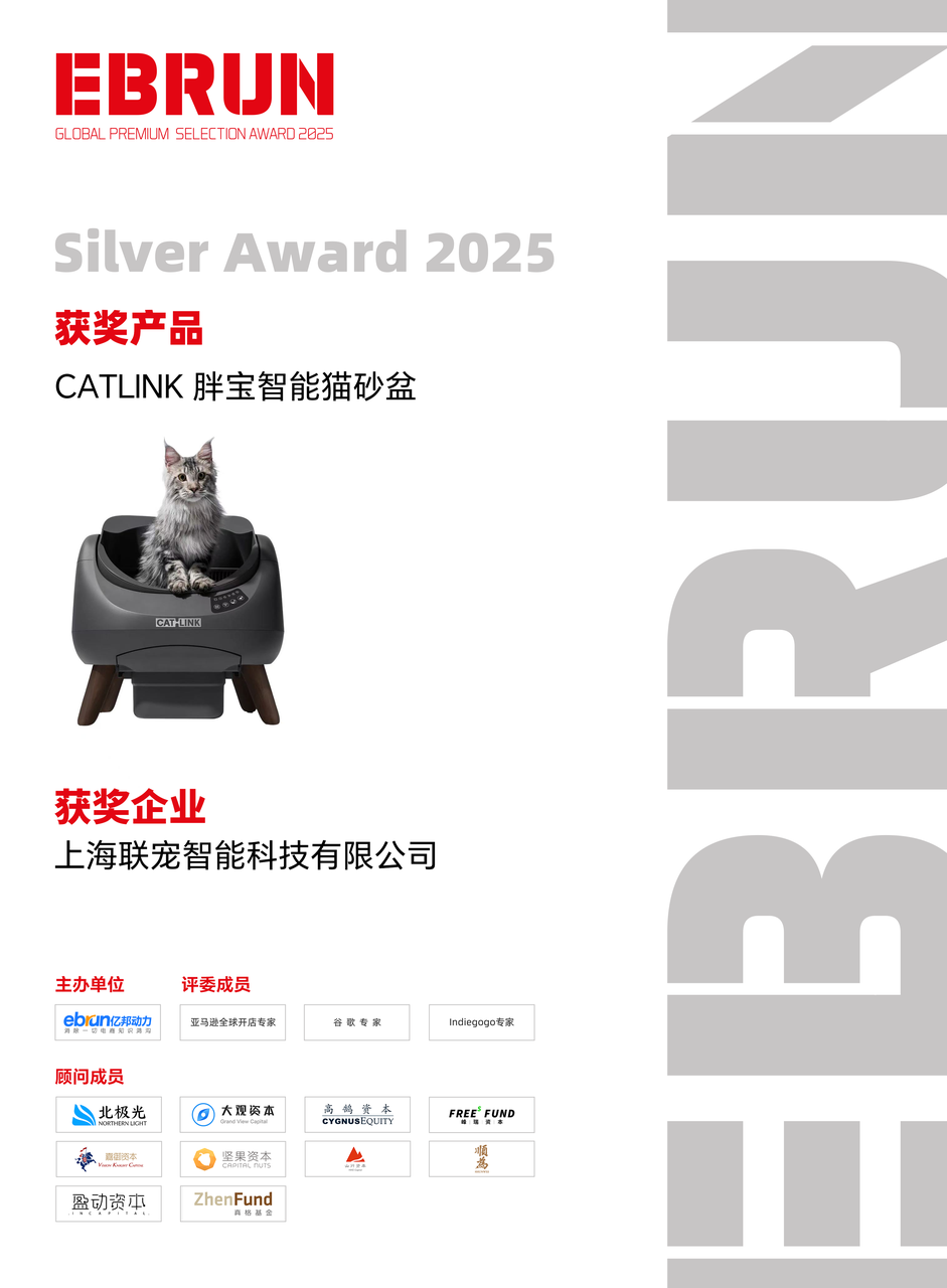 在激烈的角逐中,全球智能宠物用品领域的先行者CATLINK(上海联宠智能科技有限公司) 凭借其对大众养宠痛点的精准狙击与普惠科技理念脱颖而出。其年度爆款新品 “CATLINK 胖宝智能猫砂盆” 经过层层评审,成功斩获2025届重要奖项——EBRUN全球好物Silver Award 2025。