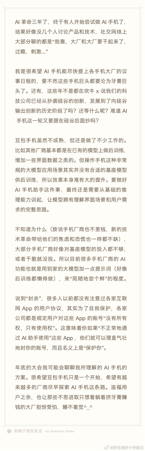 最后罗永浩表示,他会在年底的科技春晚上聊聊AI手机,希望豆包手机只是一个开始,希望有越来越多的厂商尽早探索AI手机这条路,造福用户之余,也让那些不思进取只想着躺着挤牙膏赚钱的大厂担惊受怕,睡不着觉。