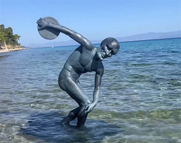 《掷铁饼者》是米隆公元前450年作品,原作已失,现存为罗马复制品,此次该艺术家定制的版本高3米,远超原作 (1.52米),重约500磅 (227公斤)。